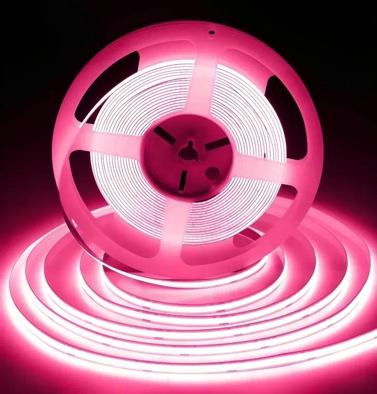 Rollo de 10 metros de cinta led COB 24VDC, luz rosada, 12 watts por metro, cortes cada 5cm, con cinta doble propósito para una fácil instalación, 8mm de grosor lo que la hace perfecta para cualquier instalación.