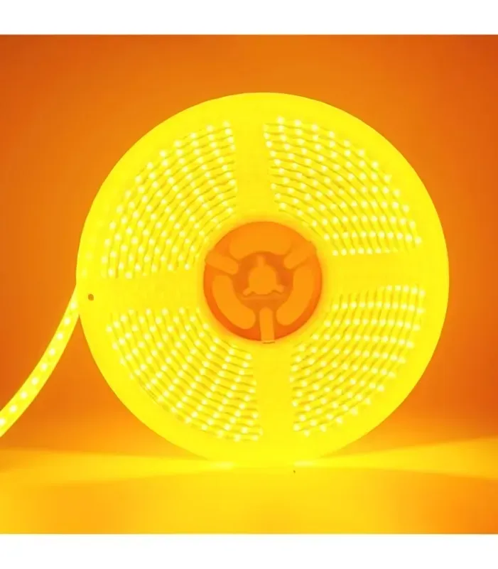 Rollo de 10 metros de cinta led COB 24VDC, luz dorada 2000k, 12 watts por metro, cortes cada 5cm, con cinta doble propósito para una fácil instalación, 8mm de grosor lo que la hace perfecta para cualquier instalación.