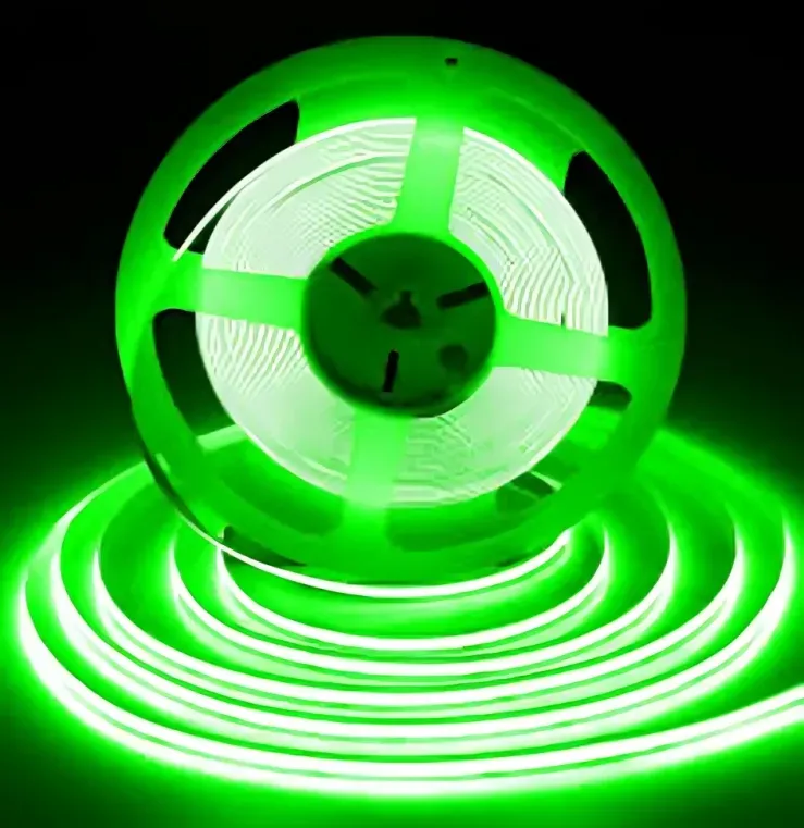Rollo de 10 metros de cinta led COB 24VDC, luz verde, 12 watts por metro, cortes cada 5cm, con cinta doble propósito para una fácil instalación, 8mm de grosor lo que la hace perfecta para cualquier instalación.